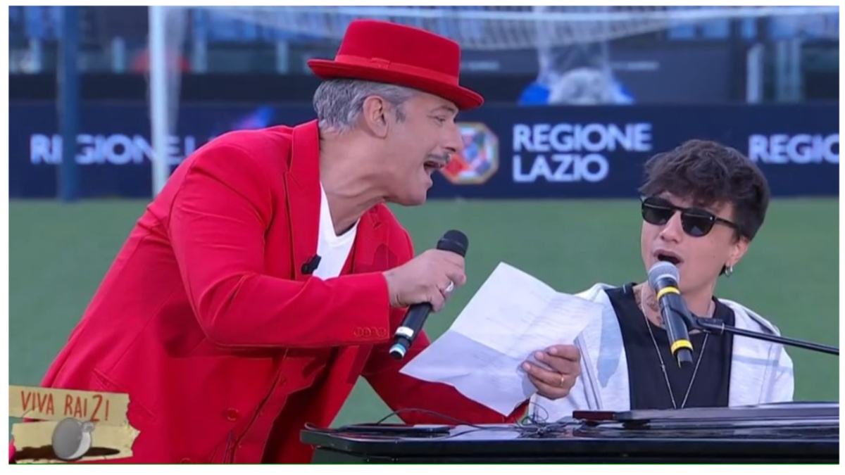 Il conduttore di “Viva Rai2!” si è collegato con lo stadio Olimpico dove Ultimo, posizionato al centro del campo con il pianoforte, ha presentato il suo nuovo singolo dal titolo “Altrove” uscito a mezzanotte. Nel frattempo, Rosario Fiorello lo ha raggiunto per duettare con lui sulle note di “Albachiara”.