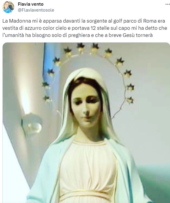 Flavia Vento ha visto la Vergine Maria. E’ la stessa ex showgirl ad annunciarlo su Twitter. “La Madonna mi è apparsa davanti la sorgente al golf parco di Roma – racconta – era vestita di azzurro color cielo e portava 12 stelle sul capo. Mi ha detto che l’umanità ha bisogno solo di preghiera e che a breve Gesù tornerà”. In passato, ha anche affermato di aver visto degli ufo.
