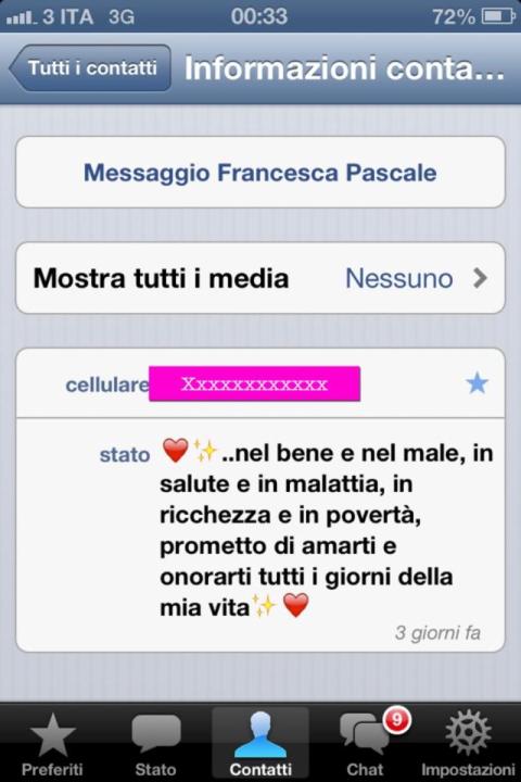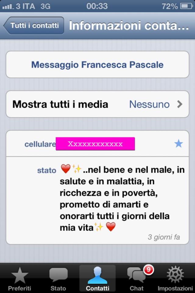 “Nel bene e nel male, in salute e in malattia, in ricchezza e in povertà, prometto di amarti e onorarti tutti i giorni della mia vita”. Recita così, stando alla foto postata su Facebook dalla “terribile” Selvaggia Lucarelli, lo status whatsapp di Francesca Pascale. La promessa d’amore, come tutto lascia pensare, è indirizzata al potente fidanzato, Silvio Berlusconi. L’ex premier, tra una sentenza e l’altra, sta vivendo un periodo difficile. La Pascale, sempre al suo fianco, non perde occasione per sbandierare sostegno e fedeltà.