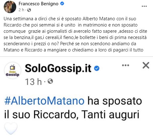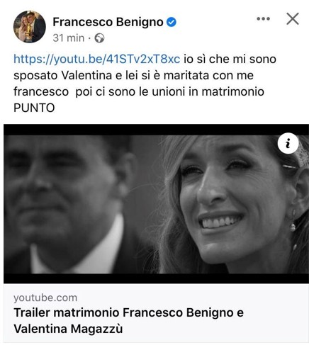 In un altro post (poi rimosso) condiviso su Facebook a corredo del video delle sue nozze con Valentina Magazzù, Benigno aveva scritto: “Io sì che mi sono sposato Valentina e lei si è maritata con me Francesco poi ci sono le unioni in matrimonio. PUNTO”.