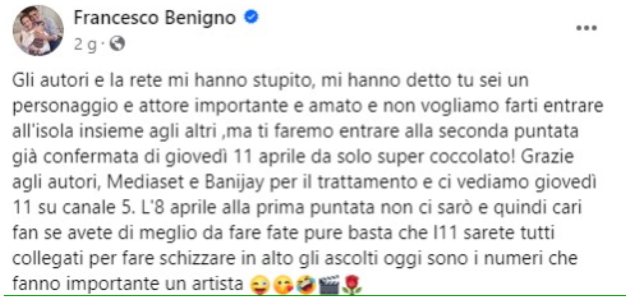 Sbirciando i canali social di Francesco Benigno, si apprende che l’attore palermitano entrerà in gioco nella seconda puntata. “Gli autori e la rete mi hanno stupito, mi hanno detto tu sei un personaggio e attore importante e amato e non vogliamo farti entrare all’isola insieme agli altri, ma ti faremo entrare alla seconda puntata già confermata di giovedì 11 aprile da solo super coccolato! – si legge in un post – Grazie agli autori, Mediaset e Banijay per il trattamento e ci vediamo giovedì 11 su canale 5. L’8 aprile alla prima puntata non ci sarò e quindi cari fan se avete di meglio da fare fate pure basta che l’11 sarete tutti collegati per fare schizzare in alto gli ascolti oggi sono i numeri che fanno importante un artista”.