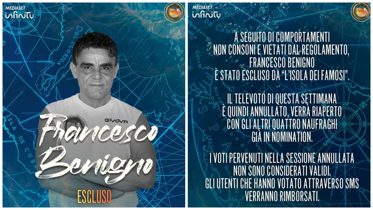 Quindi è arrivato un comunicato stampa da parte della produzione che fa sapere che il concorrente è stato “escluso”. “Comunicazione importante – si legge nella nota – A seguito di comportamenti non consoni e vietati dal regolamento, Francesco Benigno è stato escluso da ‘L’Isola dei Famosi’. Il televoto di questa settimana è quindi annullato, verrà riaperto con gli altri quattro naufraghi già in nomination. I voti pervenuti nella sessione annullata non sono considerati validi. Gli utenti che hanno votato attraverso SMS verranno rimborsati”. La versione della produzione non combacia con quella di Francesco Benigno. L’attore che al momento si trova in un resort in Honduras ha ripreso possesso del suo cellulare e ha subito condiviso un video sui suoi canali social. “Il mio ritiro è una falsità – tuona – la notizia riguardo al mio ritiro è una menzogna. Mediaset mi voleva costringere a ritirarmi mentendo spudoratamente. Questa è tutta la verità”. “Se fossi stato escluso per motivi validi, perché inventarsi un falso ritiro?”, aggiunge.