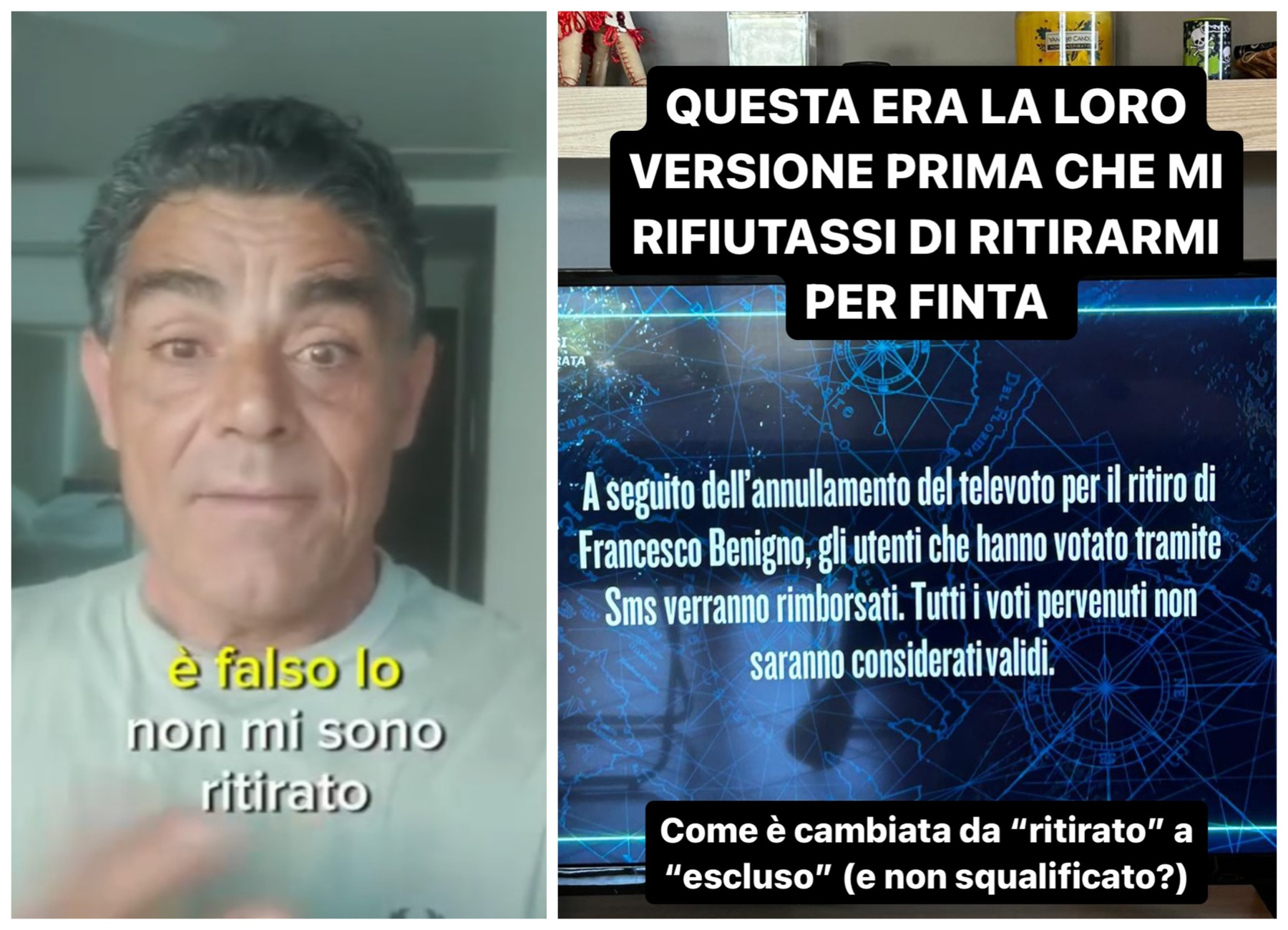 “Buongiorno a tutti, mi giunge adesso dall’Italia, telefonicamente da parte di mia moglie, che Canale 5 ha annunciato che io mi sono ritirato da L’Isola dei Famosi – esordisce Francesco Benigno – È falso. Io non mi sono ritirato. Sono stato prelevato ieri dall’Isola dopo una discussione verbale con uno dei concorrenti perché c’era rimasto male che lo avevo nominato. Era nata una discussione verbale ma nulla di più. Sono stato prelevato con una scusa che dovevano parlarmi, mi hanno portato nel resort accanto all’isola comunicandomi che io dovevo lasciare l’isola perché c’era qualcosa a loro dire che io avrei fatto ma che ovviamente non ho fatto.