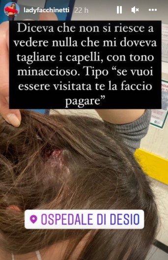 “Inizia a prendermi in giro – ha aggiunto – O lei è la persona più intelligente al mondo che con uno sguardo riesce a capire che non è nulla di che o la più stupida che pensa che il trauma cranico abbia una correlazione con la misura del taglio. Mi ha preso la testa e ha detto: ‘E’ un taglio minuscolo, non riesco a vedere nulla, ti devo rasare i capelli’. Io non capivo niente, ero rincogl**nita. Mi hanno fatto il tampone, mi hanno misurato la pressione e continuavano a prendermi in giro: ‘Sul mento ti metto il cerotto’. Sì ok, io volevo solo capire se era successo qualcosa, volevo fare una Tac. Stavo ingoiando vomito da un’ora. Niente, mi ha parcheggiato lì. Mi dispiace perché erano due sclerati, infelici con il proprio lavoro. Dobbiamo pagare di più i medici”.