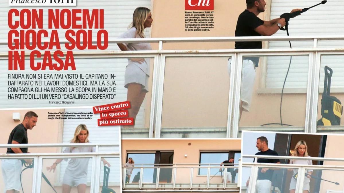 Francesco Totti… da capitano della Roma a uomo dedito alla casa e alla fidanzata Noemi Bocchi. Il settimanale “Chi” ha sorpreso il Pupone alle prese con le faccende domestiche. L’ex calciatore nonché ex marito di Ilary Blasi è stato beccato alle prese con lo sporco delle tapparelle di casa, intento a pulire con l’idropulitore, sotto l’attenta supervisione della campagna che dirige i lavori. I paparazzi lo hanno pizzicato nelle vesti di casalingo nell’attico romano in cui convive con la fidanzata e i figli di lei. La coppia, al rientro dalle vacanze alle Bahamas, ha deciso di dare una bella pulita a ogni angolo della casa, tapparelle comprese. Mentre armeggiavano con l’idropulitrice hanno fatto cadere l’acqua sporca giù dal balcone dell’attico ai Parioli in cui abitano. Ma per evitare di bagnare i balconi dei condomini hanno prontamente asciugato le pozze d’acqua.