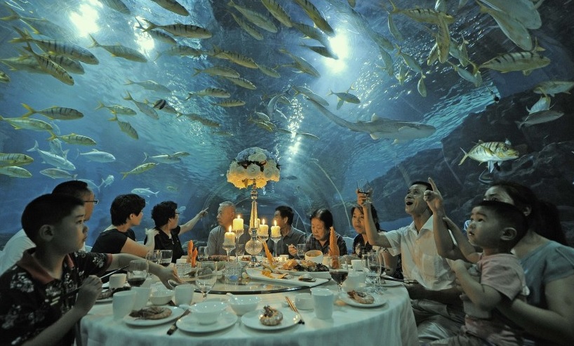 Cenare sott’acqua, si può. Ma occorre andare sino in Cina. A Tianjin, all’interno del Polar Ocean World, i responsabili dell’acquario hanno allestito un ristorante in un tunnel a vetri. A far da contorno grossi pesci e tartarughe marine.