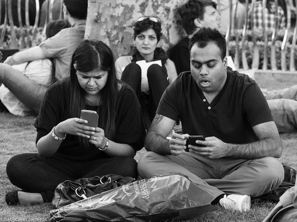 Il fotoprogetto di Babycakes Romero, dal titolo “The Death of Conversation“, mette in luce come l’avvento degli smartphone nella vita quotidiana abbia stravolto le relazioni umane, uccidendo il dialogo. Esistono studi che dimostrano che smanettiamo con il cellulare tra le 110 e le 150 volte al giorno. Che, considerando una media di 8 ore di sonno al giorno, vuol dire una volta ogni 6-9 minuti.