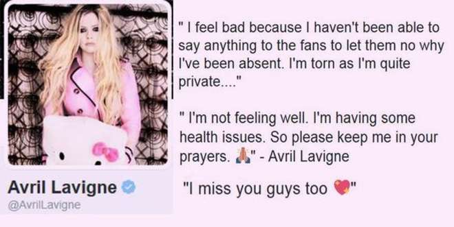 I fan di Avril Lavigne sono in allerta. La popstar canadese ha condiviso un tweet che ha destato enorme preoccupazione tra il suo pubblico. “Non mi sento bene, ho dei problemi di salute. Per favore, pregate per me”, ha scritto non precisando la natura del suo malessere. Avril Lavigne è assente dalle scene dallo scorso settembre. Nelle ultime apparizioni pubbliche, era apparsa visibilmente stanca. Gli hashtag #GetWeellSoonAvril e #PrayForAvril hanno immediatamente invaso Twitter.