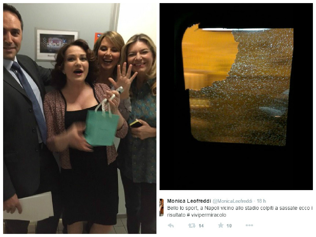 La violenza degli scontri è documentata da alcune foto pubblicate dalla conduttrice sul suo profilo Twitter. Le immagini mostrano i finestrini del pulmino andati in frantumi durante l’aggressione. “Bello lo sport, a Napoli vicino allo stadio colpiti a sassate ecco il risultato # vivipermiracolo”, cinguetta la Leofreddi.