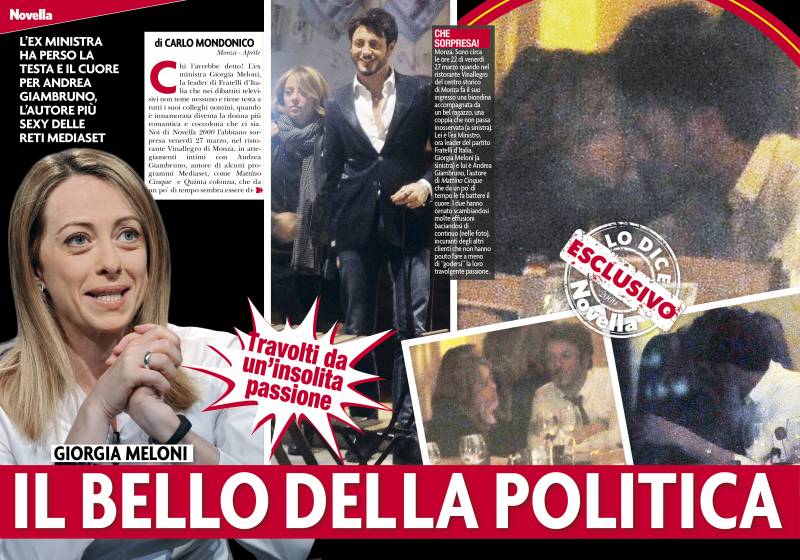 “Il bello della politica” è il titolo con cui “Novella 2000” introduce lo scoop che vede protagonisti Giorgia Meloni e Andrea Giambruno. Il leader di “Fratelli d’Italia” e il sexy autore di trasmissioni targate Mediaset quali “Mattino Cinque” e “Quinta colonna” sono stati paparazzati in atteggiamenti intimi all’interno del ristorante Vinallegro di Monza. Una serata romantica condita da baci e abbracci prontamente svelati dal settimanale di gossip. Gli scatti confermano l’indiscrezione lanciata qualche giorno fa da “Dagospia”.