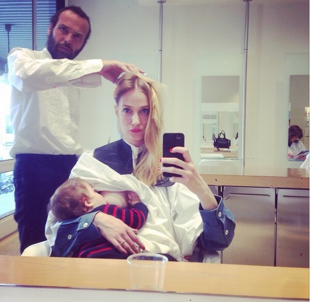 E proprio in occasione del drastico cambio di look, la top model ha postato una foto di lei durante la poppata, col parrucchiere intento ad acconciarle la chioma e l’hashtag #breastfeedind #promotingbreastfeeding.