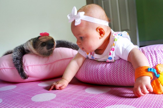 Quando Julia e Jason Heckathorn hanno adottato Daisy, un tenero cucciolo di bradipo, non sapevano di essere in attesa della loro primogenita. Due giorni dopo la sua nascita, la piccola Alia era già avvinghiata all’animaletto. La loro amicizia è indissolubile: dormono e giocano insieme e indossano le stesse fasce colorate.