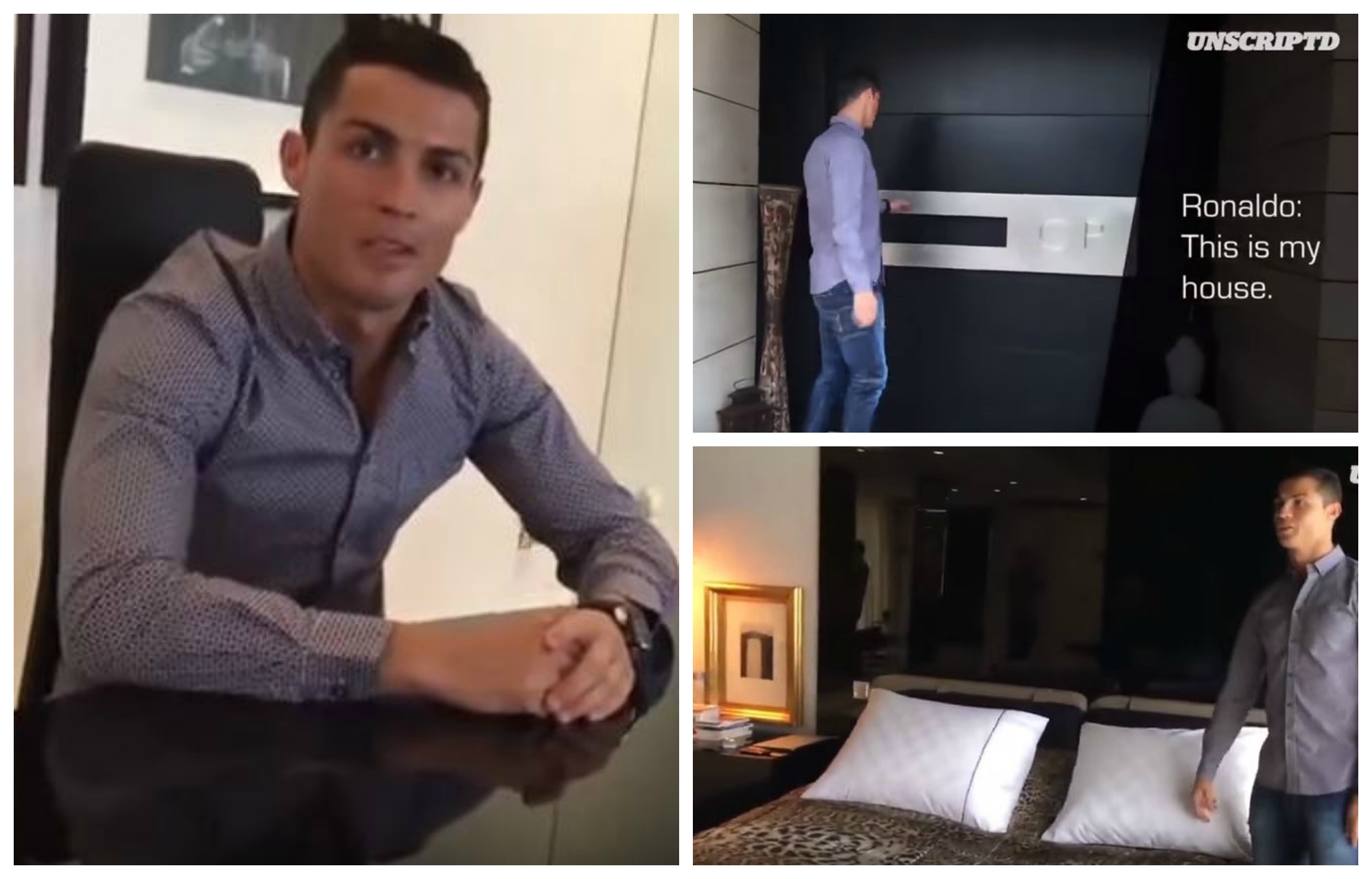 Cristiano Ronaldo apre le porte della sua lussuosa dimora situata 10 km a ovest del distretto Moncloa di Madrid. La casa, dal valore di oltre 5 milioni di euro, si estende su 800 metri quadri. L’asso del Real Madrid, che guadagna oltre 300mila euro a settimana, fa da cicerone durante il tour guidato della sua reggia composta da sette camere dal letto, otto bagni, una stanza per i trofei, una piscina, una vasca idromassaggio e un campetto da calcio.