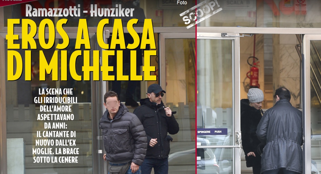 Quante volte i loro fan hanno sognato questo momento: rivedere di nuovo insieme Michelle Hunziker e il suo ex marito Eros Ramazzotti. Eccoli accontentati, perché “Novella 2000” riesce ad esaudire i desideri di chi tifa per l’amore, anche quelli più improbabili, come sorprendere Eros che fa visita a casa di Michelle, all’insaputa di tutti. Di tutti, ma non di “Novella 2000” che ha immortalato il cantante mentre intorno alle 15 di un freddo pomeriggio di fine dicembre entra nel portone del palazzo dove abita la Hunziker. La scena che gli irriducibili dell’amore aspettavano da anni. Non ci sarebbe nulla di strano, fa notare la rivista, se non il fatto che prima i due si erano incontrati solo in presenza della figlia che hanno in comune, Aurora. Stavolta invece il meeting è stato solitario, proprio mentre si diffondono le voci di una nuova gravidanza della conduttrice svizzera.