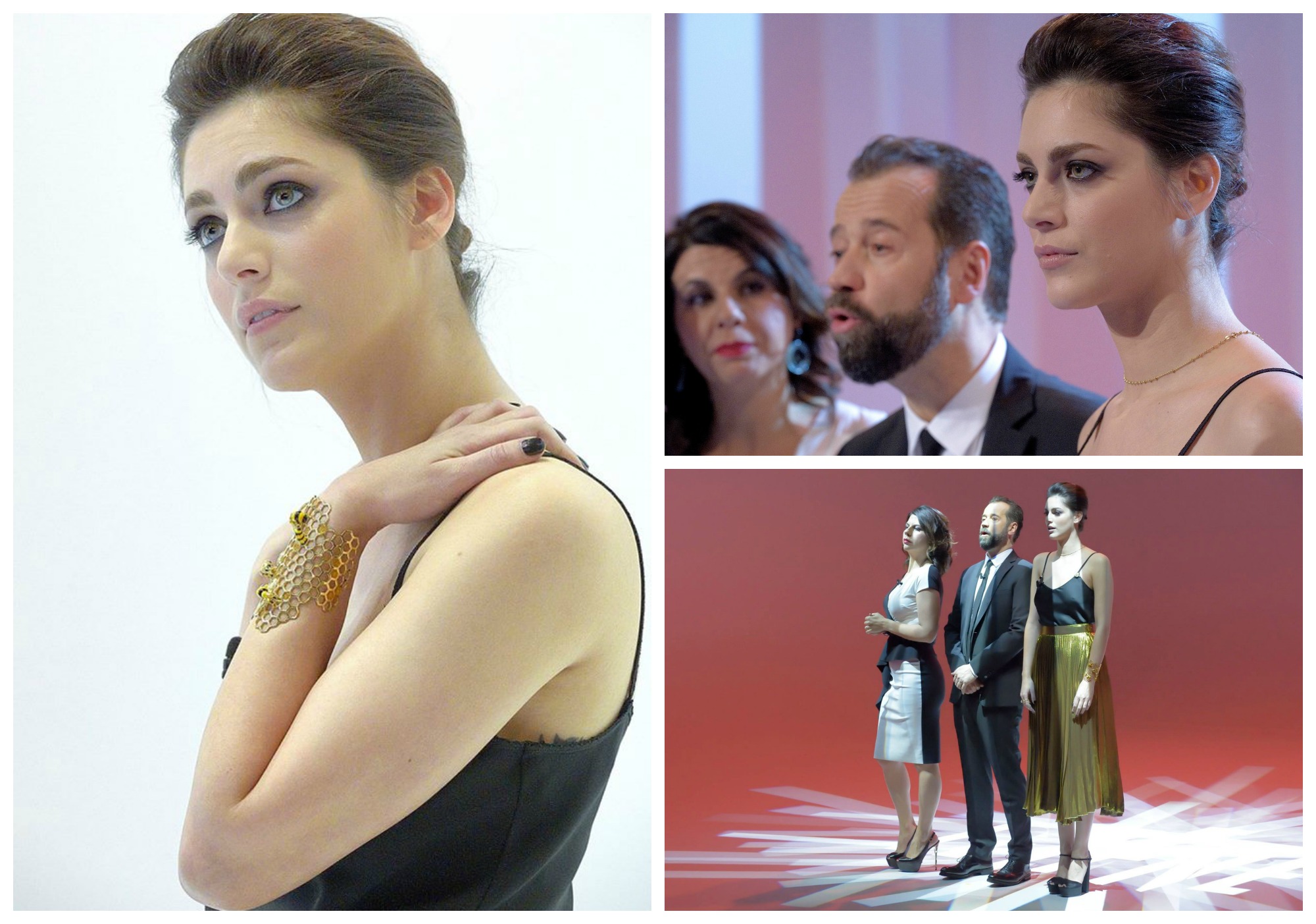 Quanto al look, c’è chi rileva che l’hanno vestita “come un Ferrero Rocher” e chi “da caramella”. La mise della Leone (top nero con bretelline e gonna alta dorata) è firmata da Gucci. La stessa Geppi Cucciari ci ha scherzato su durante la diretta: “Era difficile abbinare la gonna al colore degli occhi“. E gli occhi di Miriam bucano il teleschermo e come, accaduto per le fiction in cui ha recitato, riescono a stregare il pubblico in un secondo.