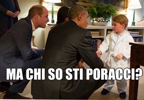 La fama del principino George, primogenito superstar di William d’Inghilterra e Kate Middleton, travalica i confini del Regno Unito. Grazie all’outfit ‘pigiama+vestaglia’ sfoggiato in occasione della visita di Barack e Michelle Obama a Kensington Palace, il piccolo blasonato è finito per l’ennesima volta sotto i riflettori ispirando numerosi meme e fotomontaggi satirici. L’hashtag di riferimento è #babygeorgetidisprezza che rimanda alla pagina Facebook che, a oggi, vanta oltre 600mila “likes”.