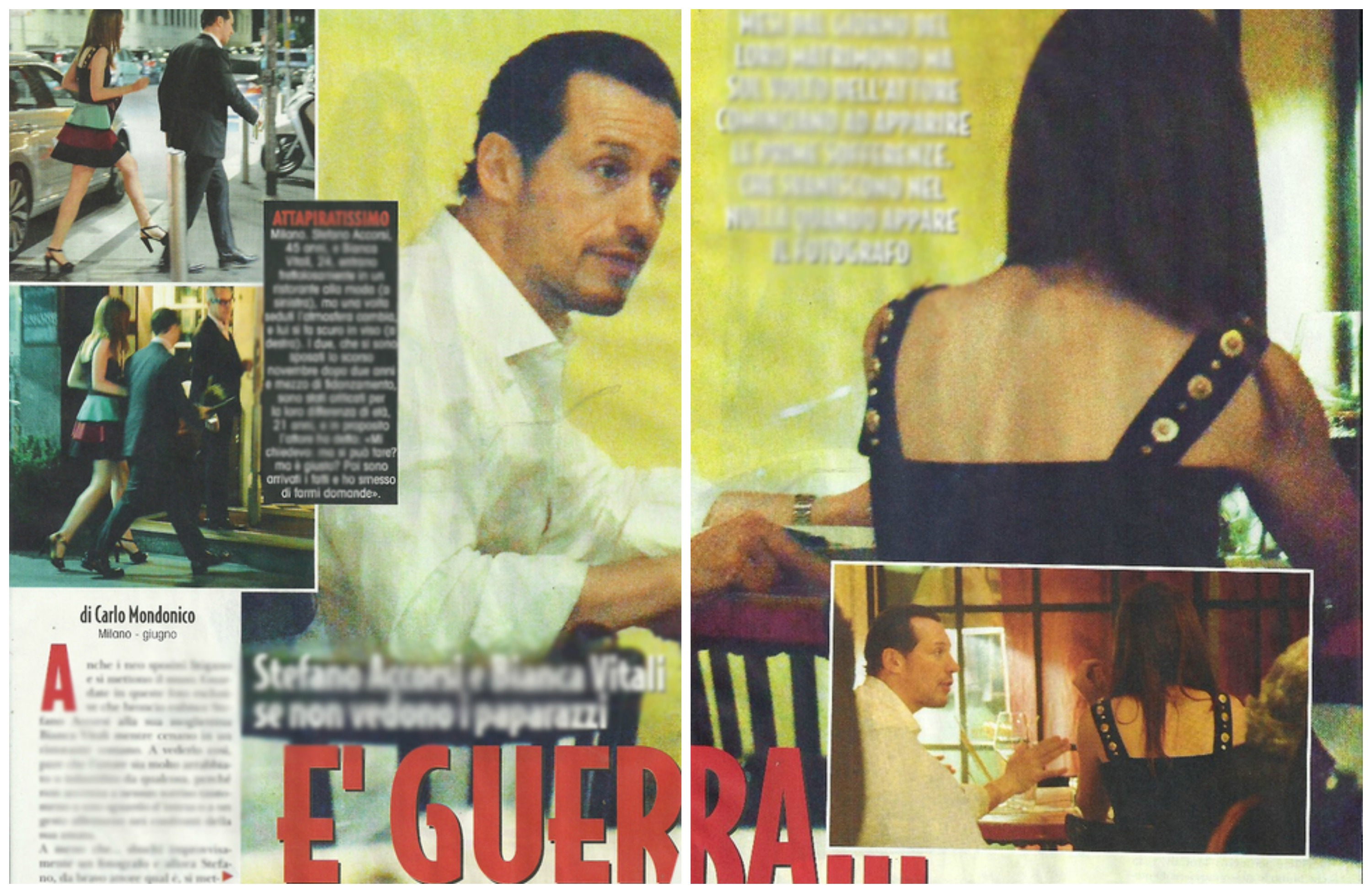 Nervi tesi e musi lunghi per Stefano Accorsi e Bianca Vitali convolati a nozze lo scorso novembre. La coppia è stata paparazzata da “Novella 2000” a cena in un ristorante milanese e la tensione si taglia col coltello. Alla vista dei fotografi, l’attore e la modella, figlia del direttore di “Tv Sorrisi e Canzoni” Aldo Vitali, ritrovano magicamente il sorriso e si scambiano baci come se nulla fosse. Lo scorso maggio la Vitali era stata paparazzata a cena a Milano con un misterioso accompagnatore.