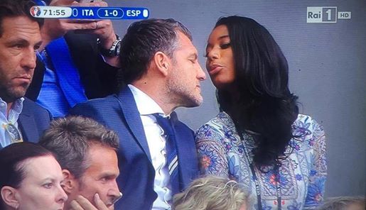 Bobo Vieri e la fidanzata Jazzma Kendrick sono inseparabili. La modella dalla pelle d’ebano che ha fatto capitolare lo scapolo d’oro del calcio italiano ha seguito il suo amato allo stadio di Parigi per assistere al match Italia-Spagna. Durante la sfida, le telecamere hanno catturato un momento di tenerezza tra i due con Jazzma che soffiava amorevolmente sul bomber. Su Twitter è partito lo sfottò: “Ha vinto anche lui”, “Vieri migliore in campo”, “Ma a lui, della partita, ca*** gliene fo***?“, “L’interesse e la tensione per la partita palpabilissimi sugli spalti”, “Bobo Vieri e la soffiatrice… #bomber #Europei2016”, “Bobo Vieri idolo incontrastato”.