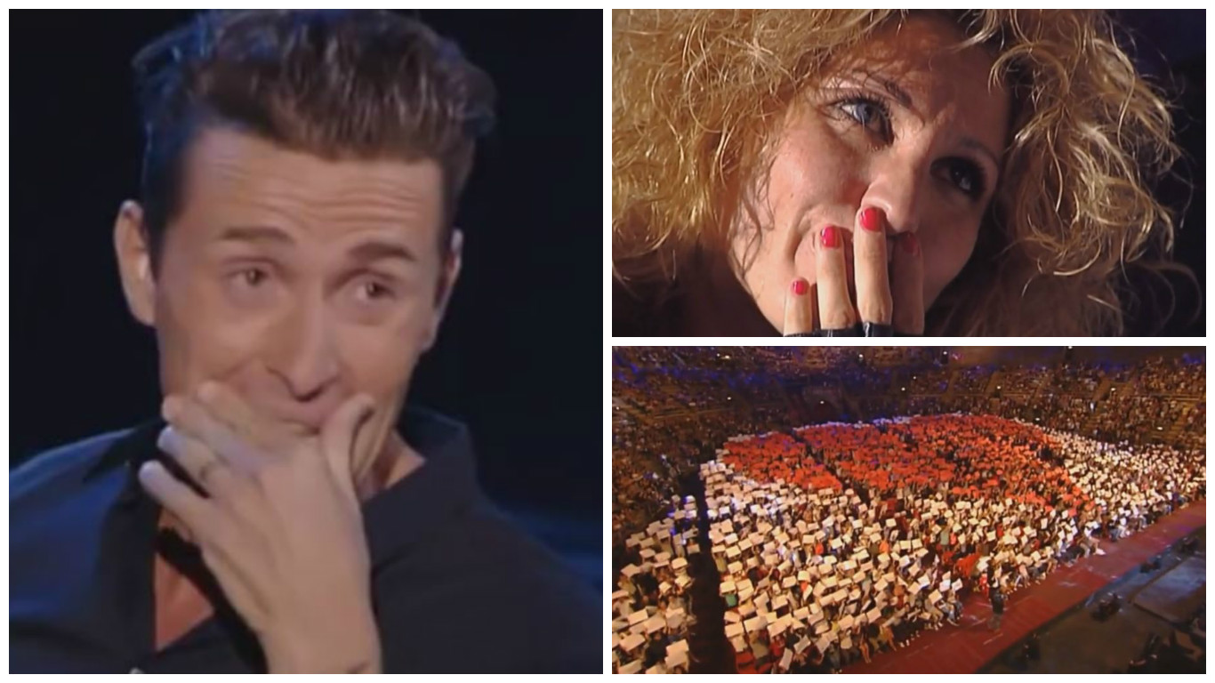 Nel frattempo, in platea, il pubblico sollevava al cielo cartoncini rossi e bianchi a formare un cuore. Tra gli spettatori presenti all’Arena di Verona anche Filippo Magnini e Federica Pellegrini. La campionessa di nuoto si è commossa sino alle lacrime.