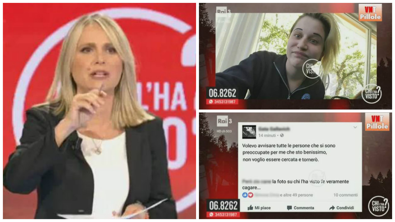 “Facciamo ancora una volta un appello. Questa ragazza ha 17 anni – racconta la giornalista – Abbiamo sentito la zia piangere al telefono. Lei prende tutto come un gioco, tanto è vero che si fa viva in un messaggio Facebook: ‘Volevo avvisare tutte le persone che si sono preoccupate per me che sto benissimo, non voglio essere cercata e tornerò. La foto su ‘Chi l’ha visto?’ fa veramente cag…”.