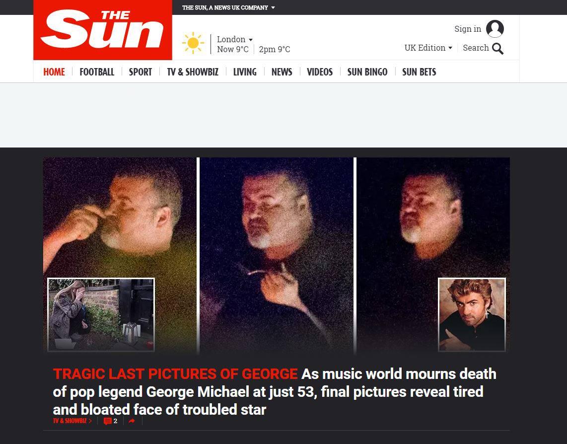 Mentre i giornali e i siti web di tutto il mondo dedicano le prime pagine e le aperture alla notizia dell’improvvisa scomparsa di George Michael, morto a 53 anni nel giorno di Natale, il tabloid britannico “The Sun” pubblica alcune recenti immagini del cantante. La leggenda del pop appare appesantita e stanca.