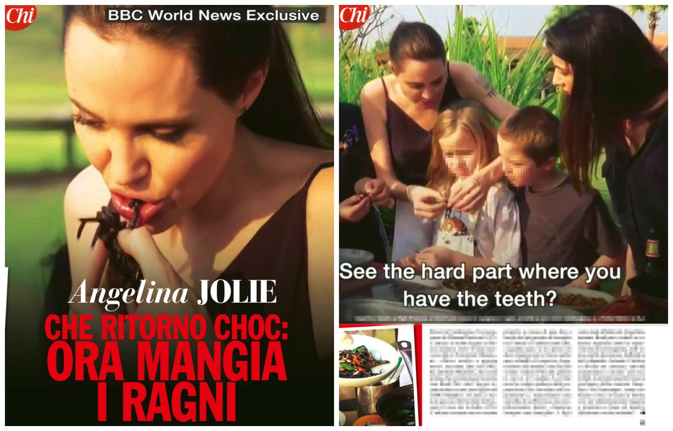 In Cambogia per la premiere del suo nuovo film “First they killed my father”, Angelina Jolie ha trovato il tempo per partecipare ad un corso di cucina durante il quale ha appreso come preparare insetti fritti. L’attrice ha dunque cucinato e assaporato insieme ai suoi figli tarantole e grilli. Vivienne, la figlia di 8 anni avuta da Brad Pitt, si è mostrata inorridita alla vista degli insetti ma poi si è lasciata convincere ad assaggiare il ragno. Le foto sono pubblicate dal settimanale “Chi”.