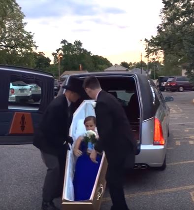 Megan Flaherty, 17 anni, del New Jersey, è arrivata al ballo di fine anno su un carro funebre. La ragazza, che da grande sogna di fare il becchino, è uscita da una bara aperta lasciando a bocca aperta i compagni della Pennsauken High School. Megan è stata bersagliata dalla critiche. Secondo alcuni, con il suo gesto, avrebbe deriso i morti. La madre della 17enne è scesa in campo per difenderla: “Non voleva offendere nessuno. Lei è così … Alcuni possono essere d’accordo sul fatto che sia divertente ….. altri non capiscono il significato dietro questo gesto. Megan ha deciso circa un anno fa che questo sarà il suo lavoro ‘da grande’. Non si tratta di mancanza di rispetto, voleva far sapere agli altri cosa farà dopo la laurea”.