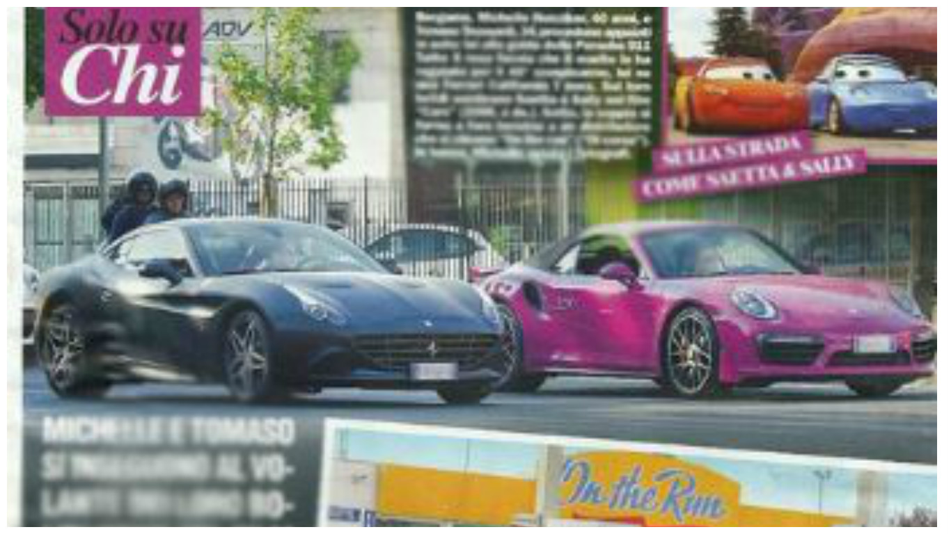 In alcune immagini rubate dal settimanale “Chi”, la conduttrice svizzera è a bordo della sua Porsche 911 Turbo S color fucsia (dal valore di oltre 120mila euro, ndr.). Il marito la segue a distanza ravvicinata su una Ferrari California di colore nero. Con loro ci sono le figlie Sole e Celeste. Niente corse spericolate, dunque.