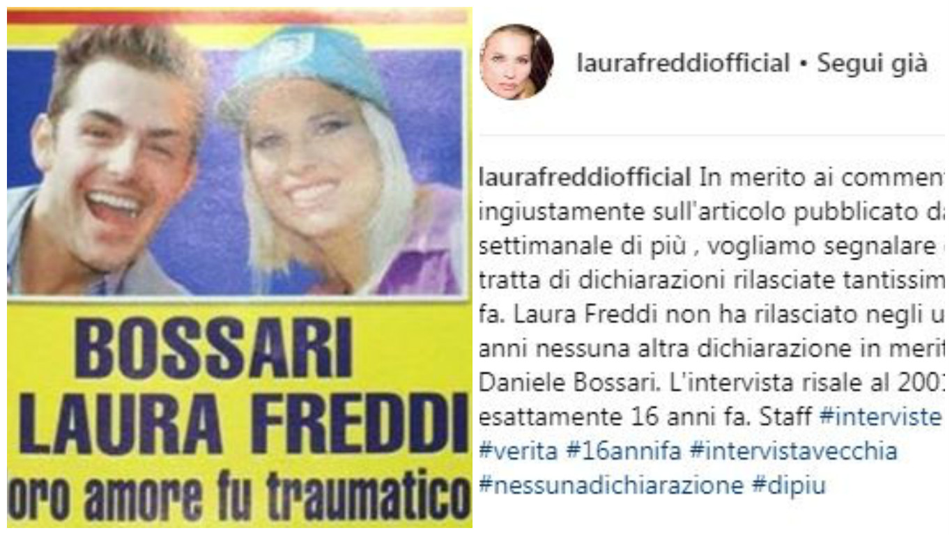 “In merito ai commenti fatti ingiustamente sull’articolo pubblicato dal settimanale di più, vogliamo segnalare che si tratta di dichiarazioni rilasciate tantissimi anni fa. Laura Freddi non ha rilasciato negli ultimi anni nessuna altra dichiarazione in merito a Daniele Bossari. L’intervista risale al 2001, esattamente 16 anni fa. Staff #interviste #verita #16annifa #intervistavecchia #nessunadichiarazione #dipiu”.