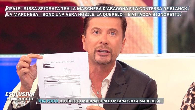 “Oggi ti ho portato questo documento – aggiunge il giornalista – perché è vero che lei ha scritto per molto tempo su ‘Nuovo’. La rubrica ‘Saper vivere’ l’ho inventata io. Un giorno le ho detto ‘Marchesa, arrivano lettere anonime, e-mail. Per favore, anche per rispetto dei lettori, dammi una pezza d’appoggio dove io se qualcuno protesta posso dire che sei davvero marchesa’. Ha risposto ‘Non devo dimostrare nulla’. Ci siamo lasciati serenamente, non mi devo vendicare di nulla. Non penso di poter chiamare io il signor Grande Fratello per dirgli ‘invita stasera la De Blanck per sputtanare la marchesa’. Mi attribuisce un potere che non ho. Questa è una delle fatture della signora Daniela Del Secco e, come vedete, c’è scritto ‘Marchesa d’Aragona di Daniela Del Secco’. Quindi lei ha una società che si chiama ‘Marchesa d’Aragona’, lei si chiama Daniela Del Secco, è figlia di un tranviere e di una casalinga, non ha nessun titolo nobiliare, ha fatto l’estetista a Catanzaro. Vive in un bilocale che non è neppure di sua proprietà all’interno di un condominio. Sulle foto, spaccia per casa sua la residenza di un amico marchese. Non puoi dire al Grande Fratello che sei marchesa perché non giochi alla pari. E’ una gara, c’è un montepremi. Lo dica, il gioco è finito. La marchesa è stata sbugiardata. Lei è schiava delle sue stesse bugie. Ci dica finalmente la verità perché il gioco è bello finché è corto. Adesso sta esagerando”.