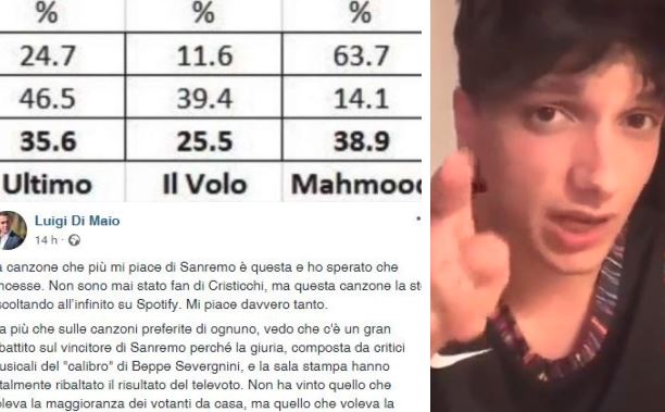 Sulla questione, nelle scorse ore, si è espresso anche Luigi Di Maio. “Più che sulle canzoni preferite di ognuno, vedo che c’è un gran dibattito sul vincitore di Sanremo perché la giuria, composta da critici musicali del “calibro” di Beppe Severgnini, e la sala stampa hanno totalmente ribaltato il risultato del televoto – ha scritto sui social il leader grillino – Non ha vinto quello che voleva la maggioranza dei votanti da casa, ma quello che voleva la minoranza della giuria, composta in gran parte da giornalisti e radical chic. E qual è la novità? Questi sono quelli sempre più distanti dal sentire popolare e lo hanno dimostrato anche nell’occasione di Sanremo. Faccio i miei complimenti a Mahmood, a Ultimo e a tutti gli altri. E ringrazio Sanremo perché quest’anno ha fatto conoscere a milioni di italiani la distanza abissale che c’è tra popolo ed “élite”. Tra le sensibilità dei cittadini comuni e quelle dei radical chic. Per l’anno prossimo, magari, il vincitore si potrebbe far scegliere solo col televoto, visto che agli italiani costa 51 centesimi facciamolo contare!”.