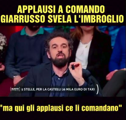 “Ecco la testimonianza di una persona che in studio avvicinandomisi si è scusata personalmente. Vi invito assolutamente a guardare e a far girare questo video! – spiega Giarrusso – Gli applausi durante i talk hanno un peso enorme nel giudizio che il pubblico si farà rispetto a quanto viene discusso in trasmissione. Come scriveva Robert Cialdini nel suo “Le armi della persuasione”, esiste un meccanismo di reazione automatica tipico della psiche umana (principio della riprova sociale) per cui quanto maggiore è il numero di persone che trova giusta una qualunque idea, tanto più io sarò spinto a credere che sia giusta quell’idea. Vi sembra un modo di fare televisione corretto ? La testimonianza diretta del pubblico, che chiede scusa ma spiega “a me pagano, ed essendo senza lavoro ho bisogno di quei soldi” è drammatica e rivelatrice. Da ora in poi state attenti agli applausi così da smascherare questa ridicola bugia degli applausi a comando!”.