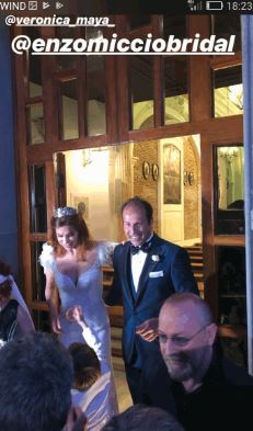 La coppia, legata da nove anni, ha tre figli, Riccardo Filippo, Tancredi Francesco e Katia Eleonora, che hanno fatto da paggetti durante la cerimonia religiosa. Veronica Maya ha sfoggiato due outfit: un abito bianco con piume sulle spalle della Bridal Collection di Enzo Miccio per la chiesa e un vestito color cipria luccicante per il party.