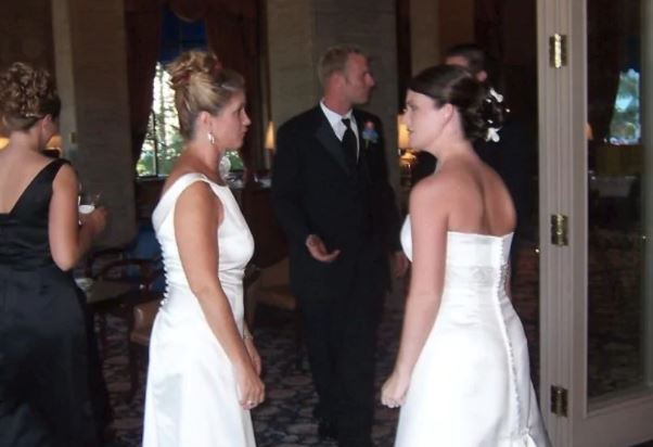 No, non si tratta di uno scherzo né di un incubo. Lo ‘psicodramma’ è andato realmente in scena, come si evince da uno scatto che sta facendo il giro del web. L’immagine ritrae la sposa intenta a scrutare la mise della madre del suo neo marito.