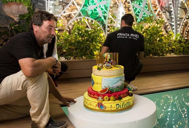 Senza parlare della torta dipinta a mano, come le bancarelle, da Luca & company, e accolta dalla festeggiata con un urlo di gioia. “Il progetto del party è nato e si è sviluppato proprio dalla torta – spiega Melilli – L’abbiamo subito immaginata con i nostri colori: il rosso, il blu, l’arancio e il giallo. E non poteva mancare l’omaggio all’Etna. Poi l’abbiamo decorata con la frutta di martorana e abbiamo aggiunto il suo nome e il numero 28. Infine, per conferirle un tocco glam e renderla più stilosa abbiamo scelto 28 candeline dorate sparkling posizionandole su una base galleggiante. Diletta ha infatti accolto con entusiasmo anche la nostra proposta di spegnere le candeline immergendosi in piscina”.