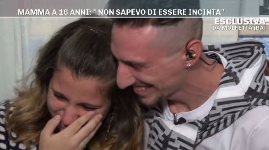 Angela, 16 anni, di Molfetta, in provincia di Bari, ha partorito in casa senza sapere di essere incinta. Due mesi fa, la giovane ha dato alla luce Francesco, frutto del suo amore per un ragazzo più grande di lei di 10 anni. Ieri a “Pomeriggio Cinque” Barbara D’Urso è tornata ad occuparsi dell’incredibile vicenda. Angela non poteva immaginare che di lì a poco avrebbe riabbracciato il fidanzato Stefano rientrato a sorpresa in Italia dall’Austria dove lavora.