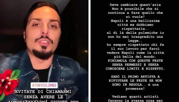 Subito dopo il fatto, Tony Colombo si è riversato sui social per comunicare ai fan che d’ora in avanti non farà più un concerto senza le giuste autorizzazioni.