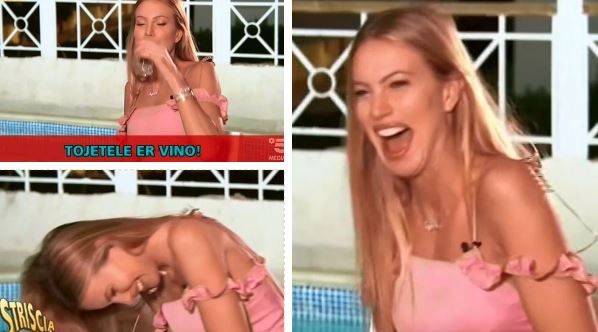 Un fuorionda trasmesso ieri sera da “Striscia La Notizia” dimostra che la bella friuliana aveva “sbevazzato” e non poco. Nel filmato mandato in onda dal tg satirico, Taylor canta e beve come se non ci fosse un domani ma soprattutto come se non fosse in collegamento con un programma tv. Ad un certo punto il tecnico suggerisce di toglierle il bicchiere e lei, preoccupata di restare a secco, beve tutto d’un fiato. La bionda influencer è talmente brilla che non riesce a mantenere l’equilibrio da seduta.
