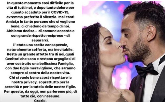 “In questo momento così difficile per la vita di tutti noi, e dopo tanto dolore per quanto accaduto per il Covid-19, avremmo preferito il silenzio – si legge in una storia pubblicata su Instagram – Ma i tanti amici, e le tante persone che ci vogliono bene, ci chiedono da tempo di noi. Abbiamo deciso – di comune accordo e con grande rispetto reciproco – di separarci. È stata una scelta consapevole, naturalmente sofferta, ma inevitabile. Resta un grande affetto tra di noi, quali genitori che sono e restano orgogliosi di aver costruito una bellissima famiglia, con due figlie meravigliose, che saranno sempre al centro della nostra vita. Chi ci vuole bene saprà rispettare la nostra privacy, soprattutto per la serenità e per la tutela delle nostre figlie. Per questo, da oggi, non parleremo più, di tutto ciò, con nessuno”.