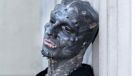 Dopo essersi fatto tatuare tutto il viso compresi i bulbi oculari ed aver diviso la lingua in due, Loffredo si è fatto amputare orecchie e naso. Ma non finisce qui. Perché il giovane, conosciuto su Instagram con il nickname “the_black_alien_project, si è anche fatto impiantare delle ”protesi” sotto la pelle della testa.