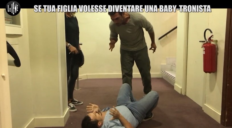 Giunto sul posto, scende dall’auto inferocito e la Capuano si mostra molto preoccupata: “Mamma mia, forse abbiamo un po’ esagerato. Succederà un casino”. Alla vista di Arca, fiutando il peggio, l’attore complice de “Le Iene” fugge disperato ma lui lo raggiunge e in un luogo dove non ci sono telecamere lo aggredisce. “Pezzo di m***a! Io ti ammazzo! Hai fatto piangere mia figlia, ti voglio ammazzare”, urla Arca.