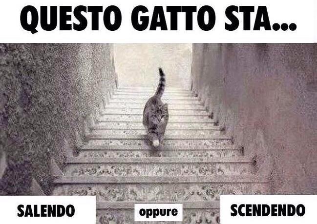 Guardate questa immagine e rispondete rapidamente: questo gatto sta salendo o scendendo le scale? Rispondere è tutt’altro che facile. Siamo di fronte ad una nuova illusione ottica che da giorni tiene banco sui social come avvenne per il caso #DressGate. Stavolta non c’è nessun vestito o colore sui quali disquisire. A far scervellare gli internauti è la posizione di un felino sui gradini. Mentre alcuni lo vedono salire, ad altri sembra che la sua zampa destra indichi una discesa. La soluzione non è stata ancora svelata. Voi che ne pensate?