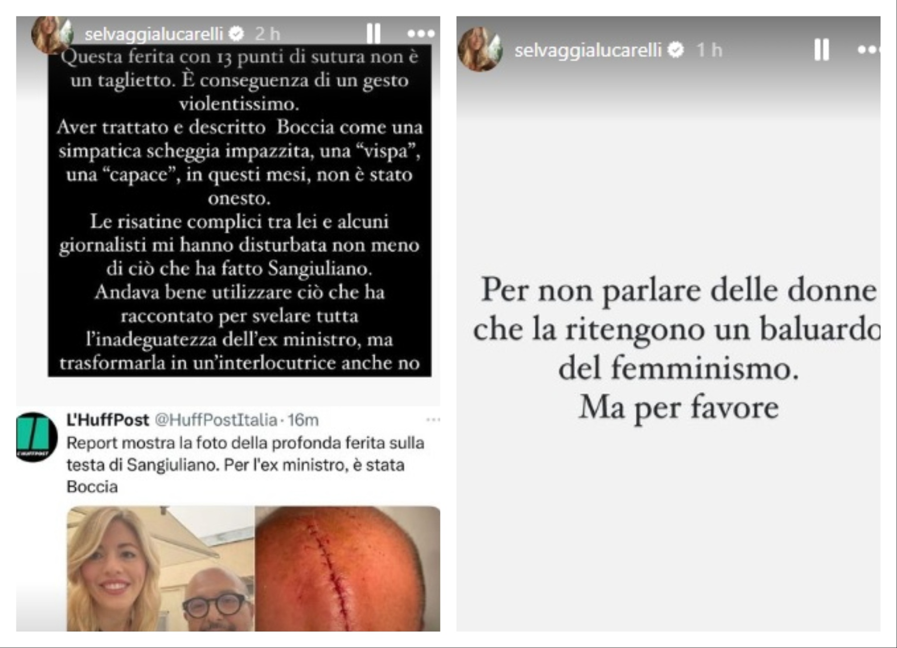 Dopo l’anticipazione di “Report” è arrivato il commento di Selvaggia Lucarelli: “Questa ferita con 13 punti di sutura non è un taglietto. È conseguenza di un gesto violentissimo. Aver trattato e descritto Boccia come una simpatica scheggia impazzita, una ‘vispa’, una ‘capace’, in questi mesi, non è stato onesto. Le risatine complici tra lei e alcuni giornalisti mi hanno disturbata non meno di ciò che ha fatto Sangiuliano. Andava bene utilizzare ciò che ha raccontato per svelare tutta l’inadeguatezza dell’ex ministro, ma trasformarla in un’interlocutrice anche no. Per non parlare delle donne che la ritengono un baluardo del femminismo. Ma per favore”.