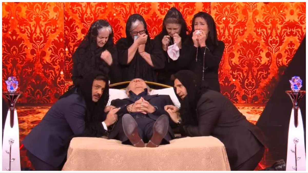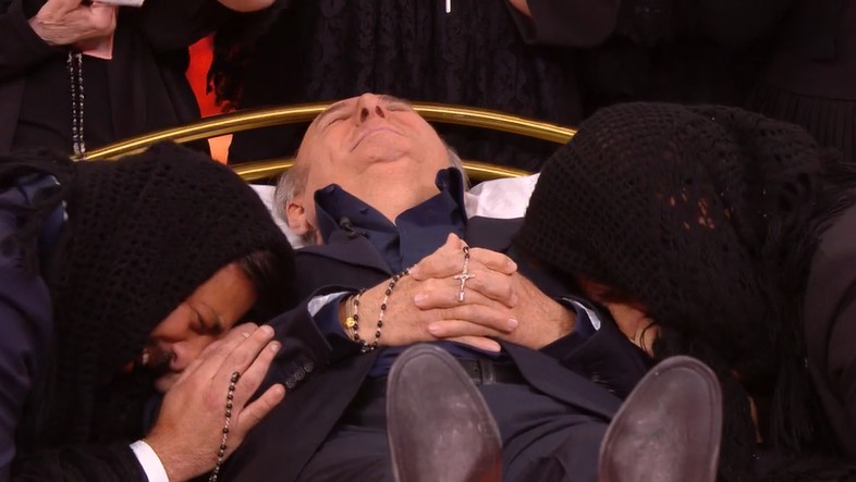 Dopo aver fatto i dovuti scongiuri, Gerry Scotti – con tanto di rosario tra le mani – si è steso su un letto circondato da lumini e corone di fiori. La veglia ha avuto inizio dopo l’ingresso delle prefiche. “Meno male che mia mamma non c’è più, altrimenti moriva veramente”, ha commentato il conduttore di “Caduta Libera”. Pio e Amedeo hanno inanellato una serie di battute: “Mo’ che non ci sei più chi ci hai lasciato? Enrico Papi?”, “Ha la stessa espressione di quelli che perdono a ‘Chi vuol essere milionario?’”, “Te l’avevamo detto noi: ‘Non la provare tu la botola’”.