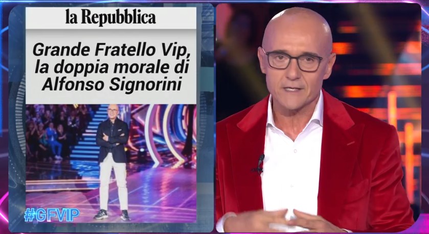 Alfonso Signorini mostra un articolo pubblicato sul quotidiano “La Repubblica” dal titolo “Grande Fratello Vip, la doppia morale di Alfonso Signorini” e a firma di Silvia Fumarola. “La collega, che per altro stimo moltissimo perché mi ha sempre fatto delle bellissime interviste, in questo pezzo dice: ‘Signorini prima squalifica Ginevra Lamborghini e poi in studio le dice ‘la gogna ‘sti gran cavoli, non hai ucciso nessuno’. La collega mi taccia, in modo bonario perché lo so, di una doppia morale. Questo non è vero! Cosa vuol dire fare la doppia morale? Abbracciare Ginevra che stava malissimo, trasmetterle tutto il mio calore, tutta quell’empatia alla quale io per due ore avevo inneggiato nel corso della puntata? Dovevo lasciarla nella sua disperazione esattamente come i concorrenti avevano lasciato nella sua disperazione Marco Bellavia? Forse quello avrebbe significato predicare bene e razzolare male”. Dalla parte di Silvia Fumarola si sono schierati i colleghi giornalisti tra cui Giuseppe Candela, penna de “Il Fatto Quotidiano” e di “Dagospia”. “Ha espresso una sua opinione su un caso di cui hanno parlato tutti – ha scritto su Twitter – La risposta in prime time su Canale 5 è sproporzionata. Se fate tv e fate pagine di me*da, potete accettare qualche stroncatura”.