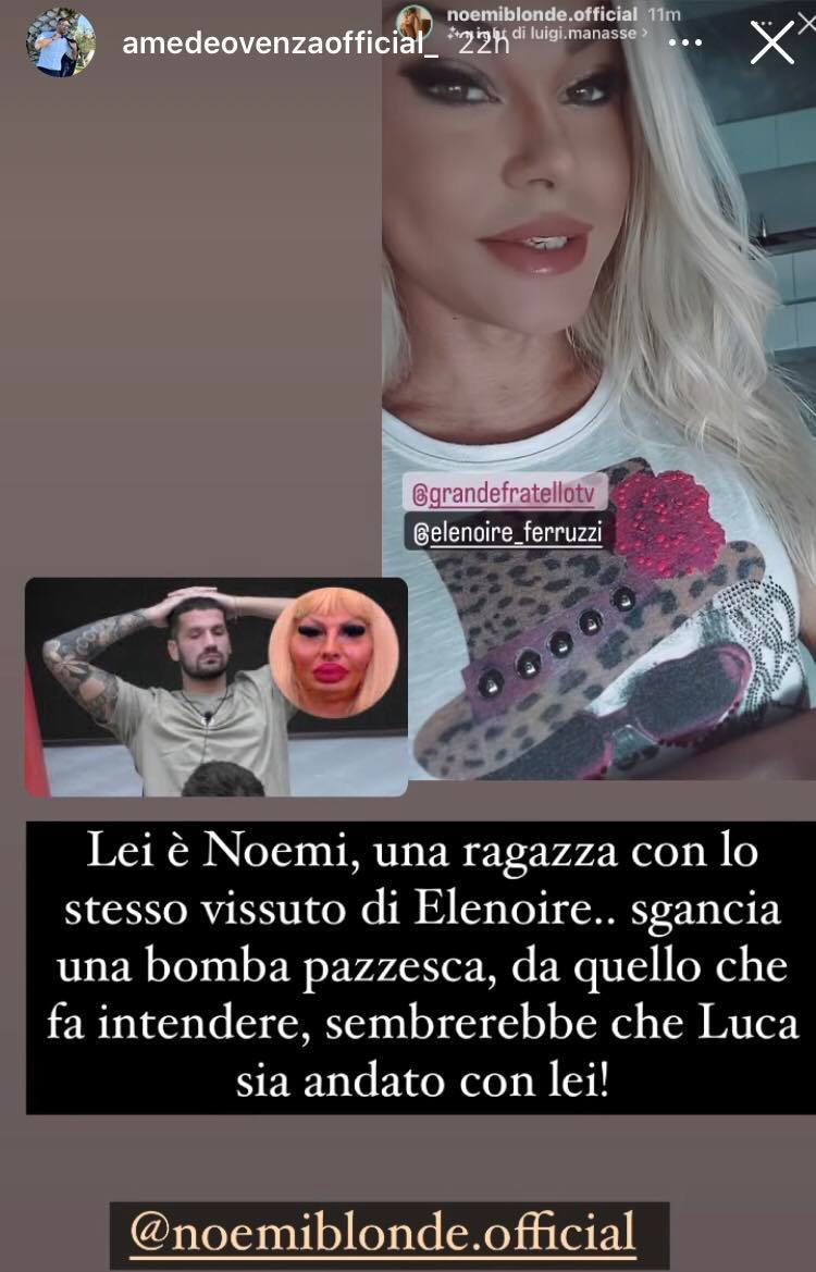 “Luca è un bravissimo ragazzo, fedele quando è fidanzato e soprattutto riservato quando si parla di se stesso. Lo conosco da 10 anni e ci siamo visti molte volte, e proprio per questo potrebbe dire semplicemente la verità ad Elenoire, cioè che non è il suo tipo visto che con le ragazze trans ha avuto esperienze! Invece di nascondersi ipocritamente solo per la paura del pregiudizio altrui”, dice Noemi ad Amedeo Venza”.
