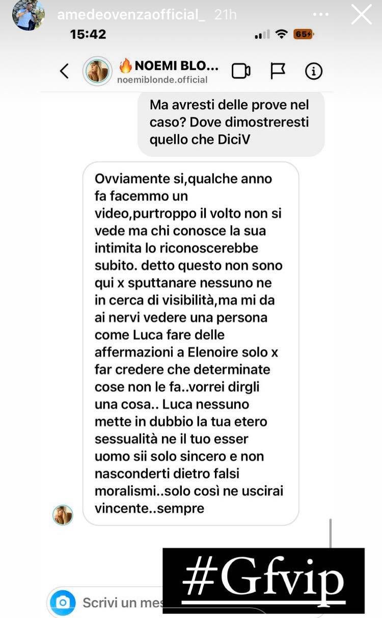 Nelle scorse ore, il gossipparo Amedeo Venza ha condiviso tra le Instagram Stories gli screenshot di alcune chat intercorse tra lui e Noemi, una transgender che sostiene di essere andata a letto con Luca Salatino e di avere dei video che proverebbero i loro incontri.