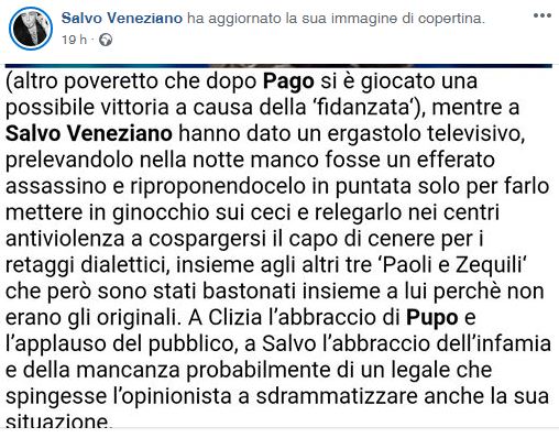 Dopo aver abbandonato la casa per aver pronunciato alcune frasi sessiste nei confronti della coinquilina Elisa De Panicis, il pizzaiolo siculo era stato bacchettato in diretta da Alfonso Signorini. Il conduttore aveva condannato le esternazioni di Veneziano e aveva approfittato di quella che ha definito una “brutta pagina di televisione” per fare una proposta costruttiva all’”imputato” e ai tre compagni (Patrick Ray Pugliese, Pasquale Laricchia e Sergio Volpini) che avevano riso dinanzi alle sue esternazioni senza bloccarlo e fargli capire la gravità di quanto accaduto. I tre ex gieffini avevano accettato di recarsi in un centro per ascoltare le storie di donne vittime di violenza.