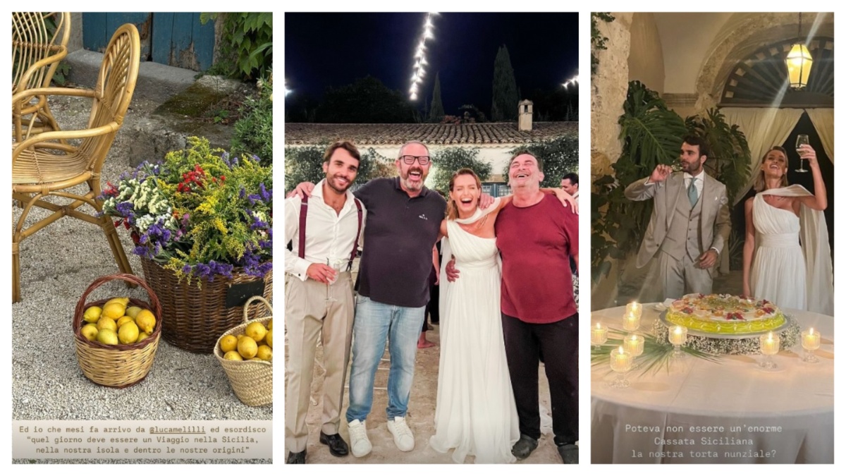 In una Instagram Story, la sposa ha immortalato un dettaglio che richiama la sua terra: alcune ceste piene di limoni. “Ed io che mesi fa arrivo da Luca Melilli ed esordisco ‘quel giorno deve essere un Viaggio nella Sicilia, nella nostra isola e dentro le nostre origini”, ha scritto in sovrimpressione. Anche il dolce nuziale rispettava le tradizioni: “Poteva non essere un’enorme cassata siciliana la nostra torta nuziale?”.
