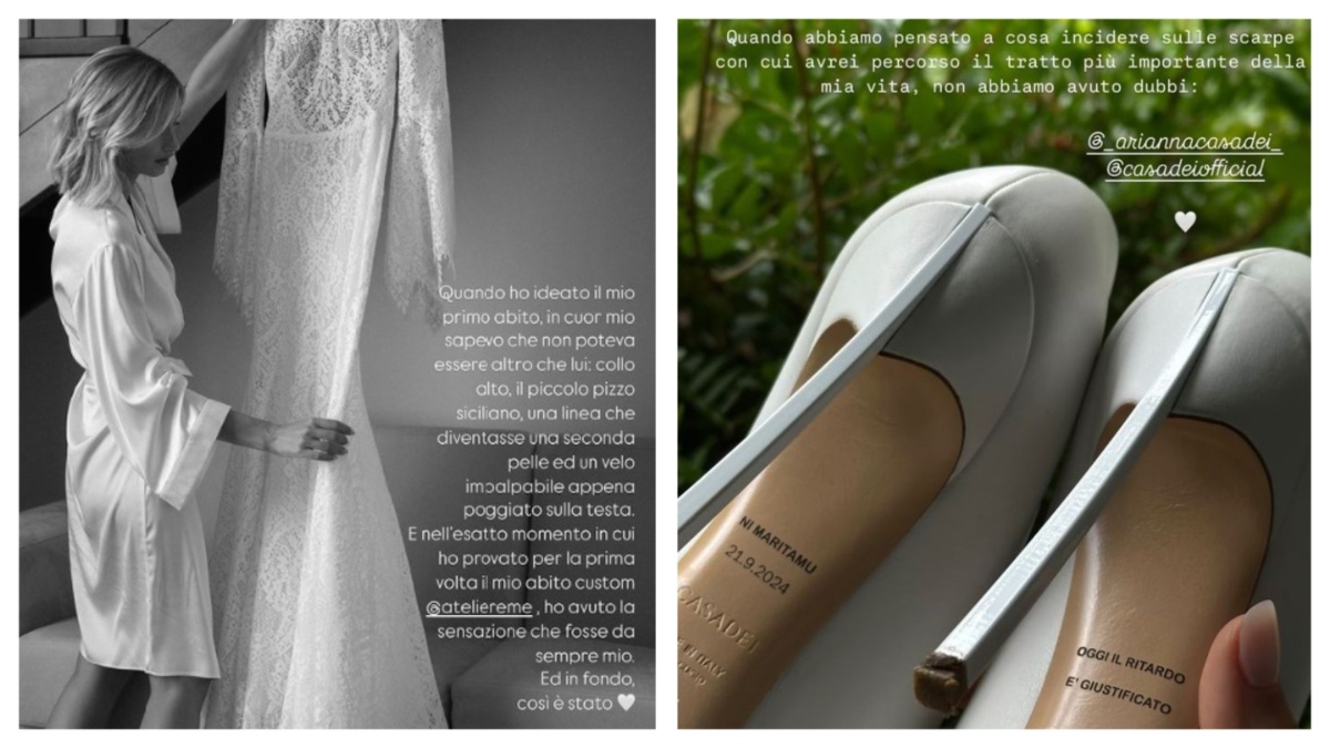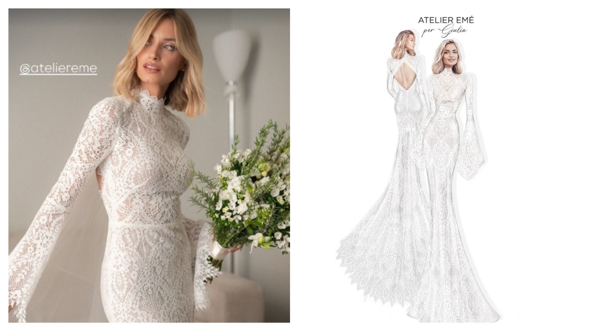 “Quando ho ideato il mio primo abito – ha scritto Giulia Arena in una Instagram Story – in cuor mio sapevo che non poteva essere altro che lui: collo alto, il piccolo pizzo siciliano, una linea che diventasse una seconda pelle ed un velo impalpabile appena poggiato sulla testa. E nell’esatto momento in cui ho provato per la prima volta il mio abito custom Atelier Emé, ho avuto la sensazione che fosse da sempre mio. Ed in fondo, così è stato”. “Quando a febbraio sono arrivata con l’idea di un pizzo piccolo siciliano e un disegno senza tempo – ha aggiunto in un’altra Story – mai avrei immaginato che mi sarei follemente innamorata di questo abito. E’ proprio vero, è una sensazione di pancia, inspiegabile”.